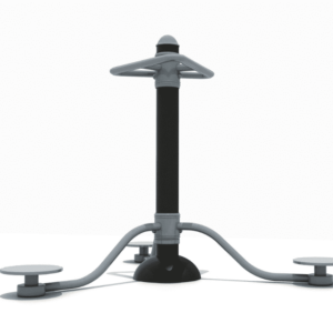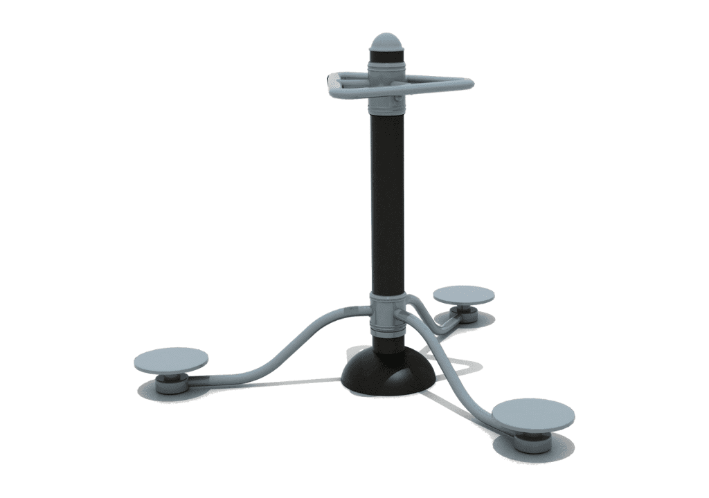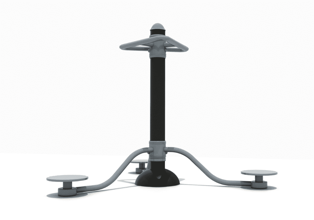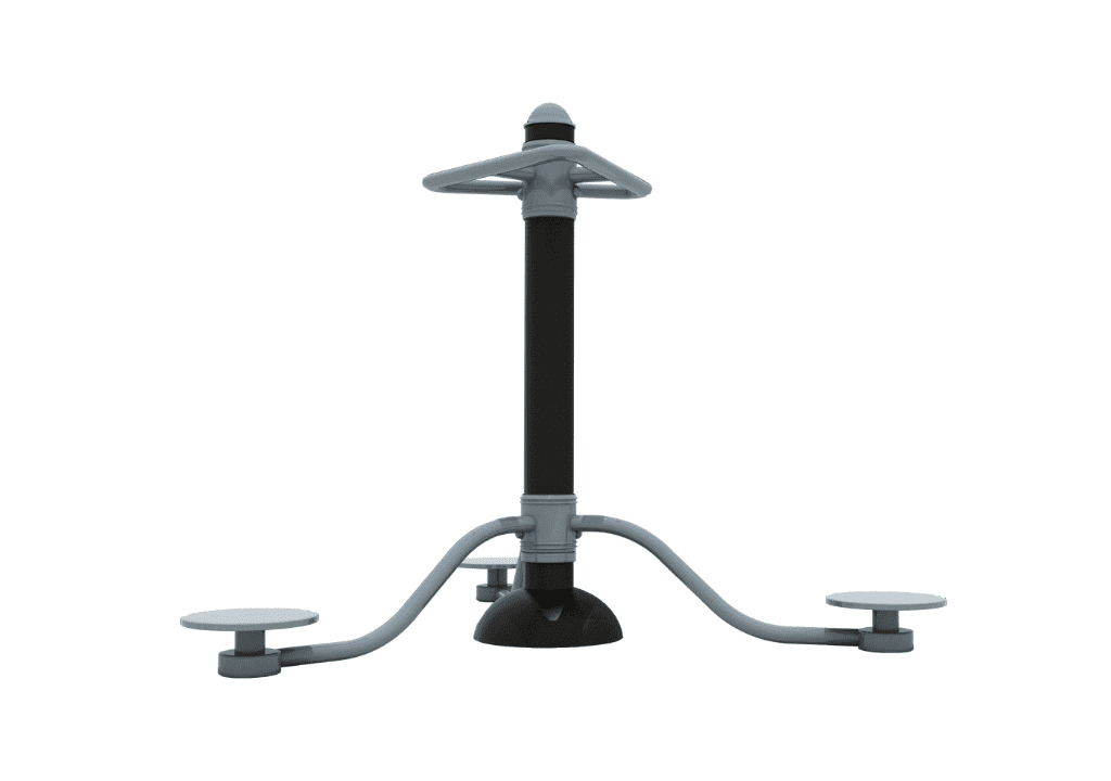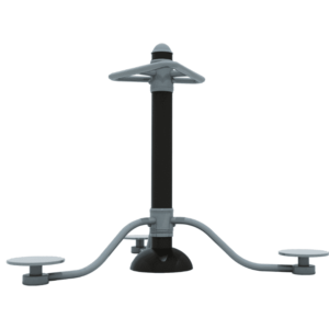 Ejercitador cintura. Con estructura metálica de acero galvanizado con acabado en pintura electrostática, resistente a rayos UV. Tubo de acero de 140mm. Medidas: 1.40 x 1.40 x 1.35 mts. Color negro y gris mate